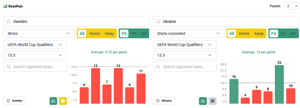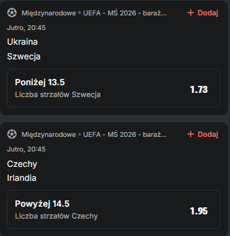Zaczynamy od starcia, w którym wyłoni się potencjalny rywal naszej kadry w barażowym finale. Legalni bukmacherzy nieco wyżej wyceniają szanse Szwedów, natomiast my niezbyt wierzymy w ich siłę przebicia i uznajemy, że zakład na poniżej 13,5 strzałów to dobry wybór. Dlaczego? Przejdźmy do liczb.