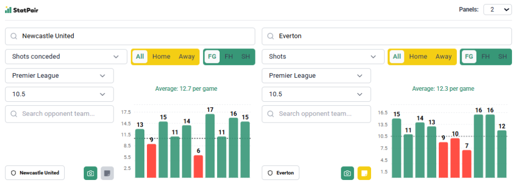 Patrząc na same nazwy zespołów moglibyśmy pomyśleć, że to mecz z jasnym faworytem. Tabela pokazuje nam jednak, że Everton spisuje się lepiej od Newcastle i nawet na jego terenie wcale nie jest na straconej pozycji, dlatego celujemy w strzały właśnie „The Toffees”. Linia 10,5 nie jest ustawiona przesadnie wysoko i uznaliśmy, że to może się wydarzyć.
