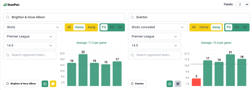 Z fauli przechodzimy do strzałów i ponownie celujemy w wynik zespołu, który już kiedyś trafialiśmy. Brighton to drużyna nastawiona mocno ofensywnie, zwłaszcza na swoim terenie i liczymy, że potwierdzi to również z Evertonem. Liczby podpowiadają nam, że gospodarzy zdecydowanie stać na oddanie 15 strzałów i już tłumaczymy dlaczego.