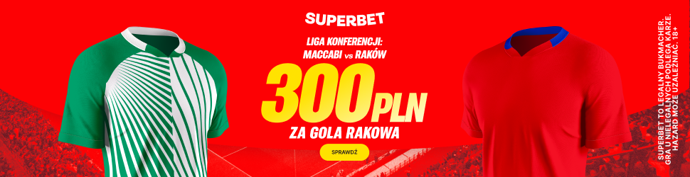 Bukmacher Superbet przygotował specjalne promocje na mecze polskich drużyn – po pełnej rejestracji z kodem PEWNIACZKI można odebrać 350 PLN za awans Jagiellonii, 310 PLN za celny strzał Nsame lub 300 PLN za gola Rakowa.