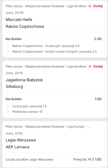 Tydzień temu swoje spotkanie wygrała tylko Jagiellonia, natomiast Legia i Raków musiały przełknąć gorzką pigułkę o smaku porażki. Jak nasze zespoły wypadną w rewanżowych starciach Ligi Europy i Ligi Konferencji? My wybieramy tradycyjnie trzy typy bukmacherskie i budujemy kupon ze wszystkich trzech polskich spotkań w czwartkowy wieczór.