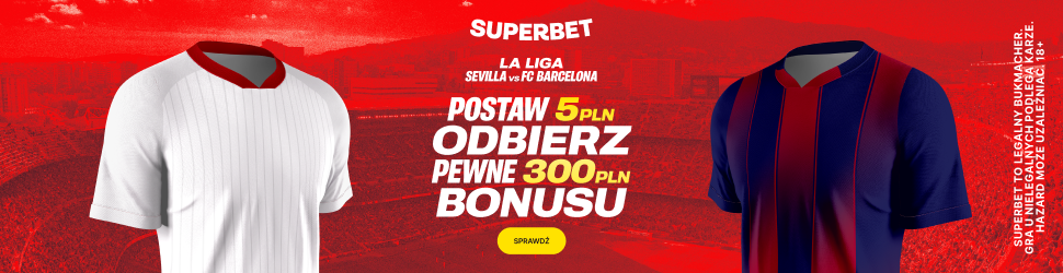 Osoby, które nie mają jeszcze konta w Superbet mogą skorzystać dziś z bardzo ciekawej oferty, która cieszy się dużym powodzeniem. Po dokonaniu pełnej rejestracji z kodem PEWNIACZKI należy zagrać dowolny zakład na mecz Sevilla – Barcelona, aby bez względu na wynik otrzymać PEWNE 300 złotych bonusu na konto.