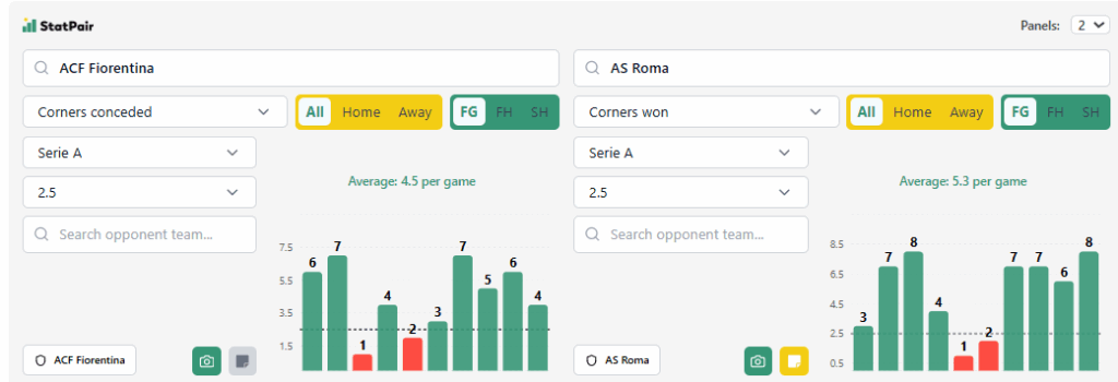 Linia 3,5 – to linia, która w obu przypadkach przewija się… no właśnie, czasami i tydzień w tydzień. Fiorentina w tym sezonie Serie A pozwalała na jej przekroczenie każdemu z 5 rywali, natomiast Roma nie zaliczyła jej tylko na inaugurację z Torino. Biorąc pod uwagę również Ligę Europy zespół z Rzymu notuje aktualnie serię 6 takich meczów, podczas których piłkę w narożniku ustawiała kolejno 7, 7, 6, 5, 8 i 6 razy. Biorąc pod uwagę również miejsce rozgrywania spotkań, poprzedni sezon i 10 ostatnich meczów również mamy większość w zielonym kolorze – rywale Fiorentiny na jej terenie pokrywali linię 7 razy, natomiast Roma w roli gościa robiła to 8-krotnie.