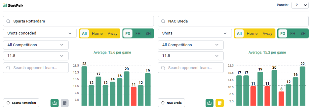 Jak strzelała Breda w 14 dotychczasowych spotkaniach? Jej średnia 13 uderzeń/mecz jest obiecującym prognostykiem, jednak trzeba przyjrzeć się też poszczególnym pojedynkom. W ostatnich 10 spotkaniach (9 ligowych + pucharowy mecz z Heraclesem) tylko raz zeszli wyraźnie poniżej linii 11,5 – było to w starciu z Go Ahead Eagles. Dwukrotnie byli na styku, a 7 razy pokryli linię, w tym tylko raz zaliczyli mniej niż 16 uderzeń (m.in. z Ajaxem i PSV). Jeszcze lepiej wyglądają liczby strzałów oddawanych przez rywali Sparty. Zespół gospodarzy na 10 meczów raz dopuścił do 11, pozostałe mecze to pokryta linia, czasami ze sporym zapasem, ale najlepszy jest bilans domowy. Jak wyglądają liczby u siebie? 24, 20, 7, 23, 17, 14, 16, 20 i 12 strzałów przeciwnika.
