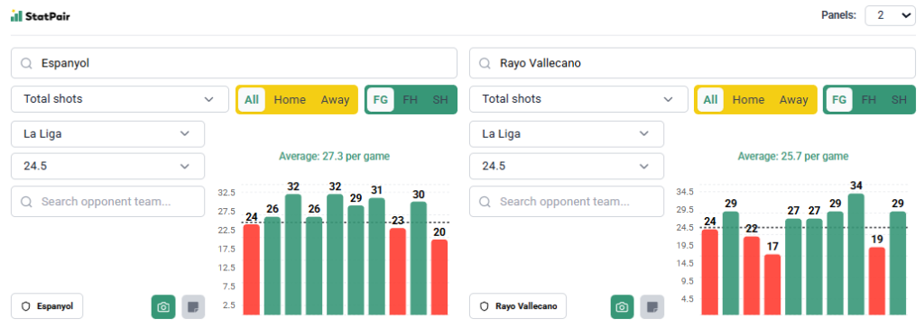 Żeby nie przedłużać, wyciągniemy liczby strzałów w obu przypadkach. Espanyol sporo strzela i pozwala na dużo, a linię 24,5 pokrywał w 7 z 10 ostatnich meczów La Liga (pozostałe to 24, 23 i 20) – Pucharu Króla nie liczymy, bo tam grał z zespołami z niższych lig. W przypadku Rayo Vallecano mamy podobną sytuację, czyli sporo prób w obie strony. Linia 24,5 była pokrywana w 6 z 10 meczów La Liga, a ostatnie starcia to 27, 27, 29, 34, 19 i 29 uderzeń. W Lidze Konferencji mieliśmy 22 strzały ze Shkendiją (aż 20 to Rayo), 21 z Hacken, 38 z Lechem (29 Rayo) i 32 ze Slovanem (23 Rayo). Poprzedni sezon to także dobre liczby – najpierw w sierpniu strzałów było 27, a w kwietniu aż 31.