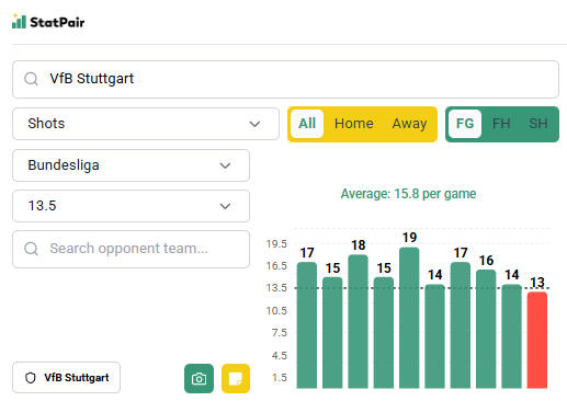 Skoro gra Stuttgart to patrzymy na to, jakie linie na strzały ustawili legalni bukmacherzy. W sobotę w ofercie widniała liczba 13,5, która akurat w przypadku tego zespołu wygląda na misję jak najbardziej do wykonania, dlatego zaczynamy kupon od tego zakładu. Co mamy na swoją obronę?