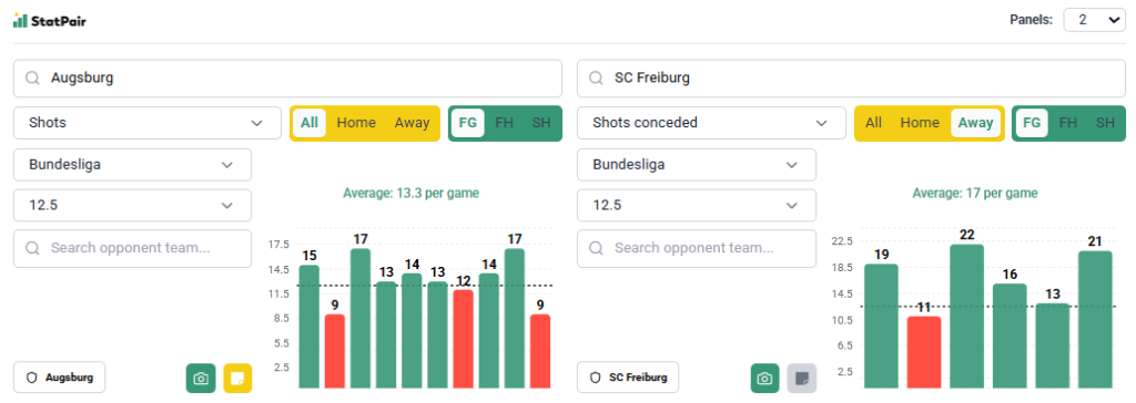 Zespół z WWK Arena w ostatnich tygodniach szuka szczęścia i oddaje całkiem sporo strzałów – na 10 kolejek Bundesligi linię 12,5 pokrywał 7-krotnie, nawet z mocnymi rywalami pokroju Lipska, Stuttgartu, Hoffenheim czy Bayeru Leverkusen. Jako, że Augsburg gra o utrzymanie i potrzebuje punktów to po prostu musi atakować – nie ma innego wyjścia. Skoro robili to z czołówką tabeli to z Freiburgiem wcale nie musi być inaczej zwłaszcza, że dwa poprzednie starcia to 13 i 14 uderzeń. Sam zespół gości na swoim terenie nie pozwala przeciwnikom na zbyt wiele, ale wszystko zmienia się, gdy nie gra u siebie. 9 dotychczasowych wyjazdów Freiburga to trzy undery, a ostatnie liczby strzałów oponentów to 19, 11, 22, 16, 13 i 21. W Lidze Europy też nie było kolorowo – Bologna oddała tylko 8 strzałów, ale Nice i Viktoria Pilzno kończyły z 17 i 19 próbami.