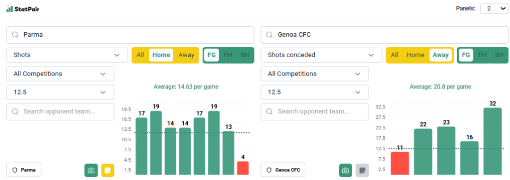 Dlaczego gramy taki typ? Średnia strzałów Parmy nie jest imponująca (11), ale wiadomo – często zaniżają ją pojedyncze bardzo słabe mecze, zwłaszcza z mocnymi rywalami. W przypadku gospodarzy robią to choćby 4 uderzenia z Interem i Napoli, a więc absolutnym czubem tabeli. Poprzednich 10 kolejek to, poza wspomnianymi spotkaniami, tylko dwa undery oraz 6 pojedynków zakończonych 13 strzałami lub wyżej. Grając u siebie Parma w tym okresie linii nie pokryła jedynie z Interem – pozostałe spotkania to 14 strzałów z Milanem, 17 z Udinese, 19 z Lazio oraz 13 z Fiorentiną. W skrócie: linia pokryta w starciach z rywalami mocniejszymi niż Genoa.