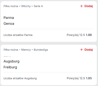 Goście to zresztą przeciwnik, na którym strzały nabija się całkiem łatwo. W ostatnich 10 kolejkach Serie A linię 12,5 pokrywało 7 zespołów, a szczególnie dobrze radzą sobie drużyny grające u siebie. Genoa na wyjazdach przyjmowała 13 uderzeń lub więcej aż 7 razy, choć zdarzały się tam wyniki na styku. Trzy poprzednie delegacje to już naprawdę solidne liczby – 23 uderzeń Romy, 18 w wykonaniu Udinese czy aż 32 Milanu to wystarczający powód, żeby w kwestii strzałów faworyzować Parmę.