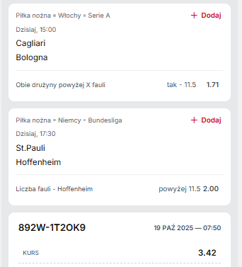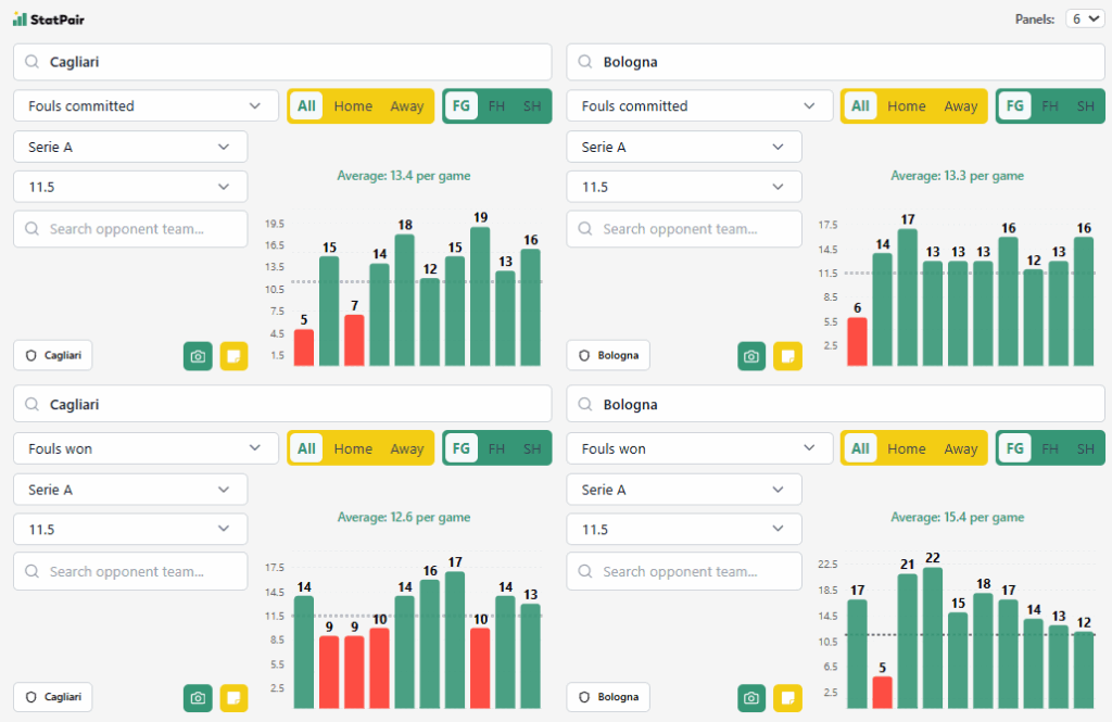 Jak było w poprzednim sezonie i obu starciach Cagliari z Bologną? Tutaj mamy… ponownie 100% pokrycia – najpierw 18-15, potem 15-22. Mając aż tyle zielonych słupków wchodzimy w to, nawet mimo wysokich linii w obu przypadkach. Wczoraj mecz Romy z Interem dał absurdalną liczbę fauli, więc czemu nie tutaj, skoro wszystko się zgadza?