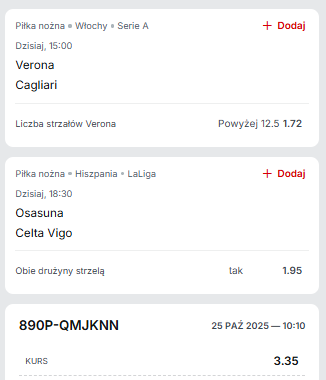 Sobota była dla nas świetna – w kasie mamy dubla analizowanego na stronie oraz drugiego udostępnionego w socialach oraz na naszym profilu Superbet. Czy utrzymamy świetną formę również w niedzielę? Na pierwszy kupon wrzuciliśmy dwa typy bukmacherskie z Serie A i La Liga, natomiast więcej propozycji szukać możecie na pewniaczkowych kanałach. Oprócz tego macie dziś szansę na odebranie ciekawych bonusów za hitowe zmagania.