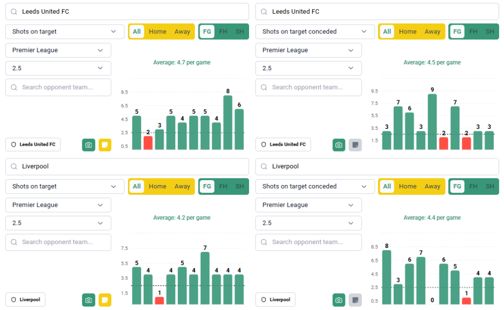 Niedawno analizowaliśmy grę Leeds United, więc o ofensywnym nastawieniu tego zespołu już wiecie. Tym razem „Pawie” wybierają się na Anfield, gdzie z Liverpoolem będzie bardzo trudno. Uważamy, że goście są w stanie oddać minimum 3 strzały, na co gospodarze odpowiedzą tym samym – za takim wyborem stoją liczby z poprzednich tygodni.