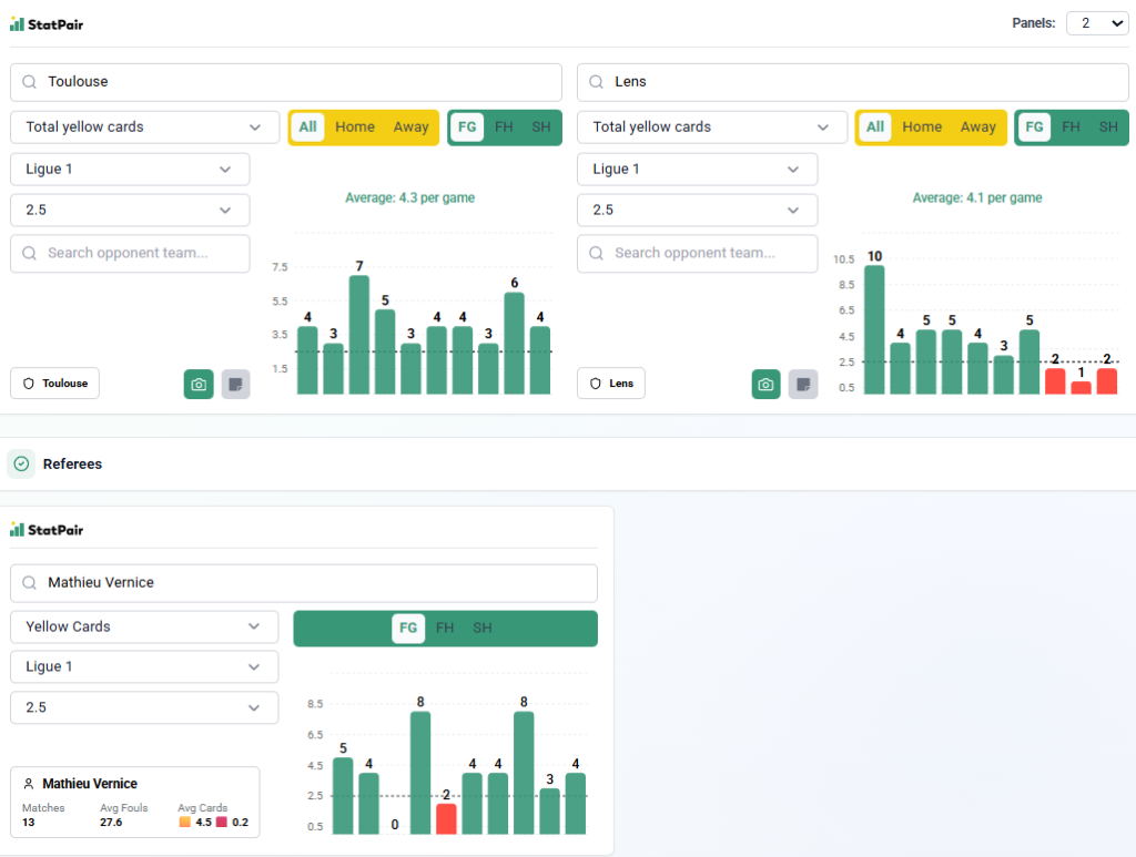 Do zakładu X2 dorzucamy też liczbę kartek, minimum trzy – jedni i drudzy sporo faulują, więc to chyba całkiem realne założenie. W ostatnich 10 kolejkach taką liczbę można było zobaczyć we wszystkich spotkaniach Toulouse oraz 7 spotkaniach Lens, a także 6 kolejnych meczach bezpośrednich. Najostrzej było w tych z poprzedniego sezonu – najpierw w Lens sędzia pokazał 7 żółtych i 1 czerwoną, a w rewanżu „tylko” 7 żółtych. Tutaj pomóc może sędzia Mathieu Vernice, który w tym sezonie Ligue 1 pokazywał 4, 4, 8, 3 i 4 kartki.