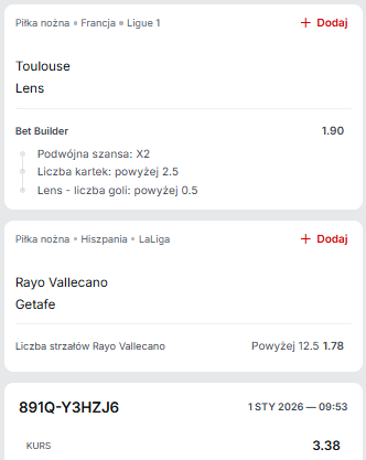 We Francji Nowy Rok zaczynamy od starcia dwóch drużyn w formie, gdzie legalni bukmacherzy faworyta nie wskazują. To rewelacyjny zespół Lens jest jednak w większym gazie, dlatego uważamy, że wyjedzie z Tuluzy z minimum jednym punktem, a do tego dorzucamy też zakład na 3 kartki lub więcej.