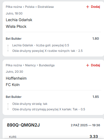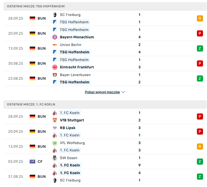 BTTS i Hoffenheim to zgrany duet już od dawna. Sezon 2023/24: 85% meczów zakończonych w ten sposób (29/34), sezon 2024/25: 68% meczów (23/34), sezon 2025/26: jak na razie wszystkie 5 spotkań. Niezależnie od tego, kto jest trenerem i jak wygląda kadra: „Wieśniaki” gwarantują emocje pod obiema bramkami i na to czekamy również w piątek. Koeln w tym sezonie niewiele odbiega od rywala w tej kwestii, bo tylko 1 z 5 meczów kończyło z zerem po którejś stronie – wtedy, gdy pokonało 1:0 Mainz. Pozostałe mecze to już gole w obie strony i za każdym razem przekroczona linia 2,5. Tutaj też dzieje się bardzo, bardzo dużo.