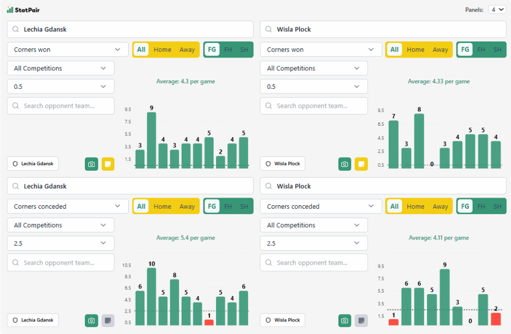 Co do rzutów rożnych – tutaj też jest w porządku. Lechia w Ekstraklasie 3 kornery lub więcej wykonywała w 9 z 10 spotkań i tyle samo razy pozwalała na to swoim przeciwnikom. W przypadku Wisły także mamy dobre statystyki w postaci 8 z 9 spotkań z pokrytą linią oraz 6 pojedynków, gdy robił to rywal.
