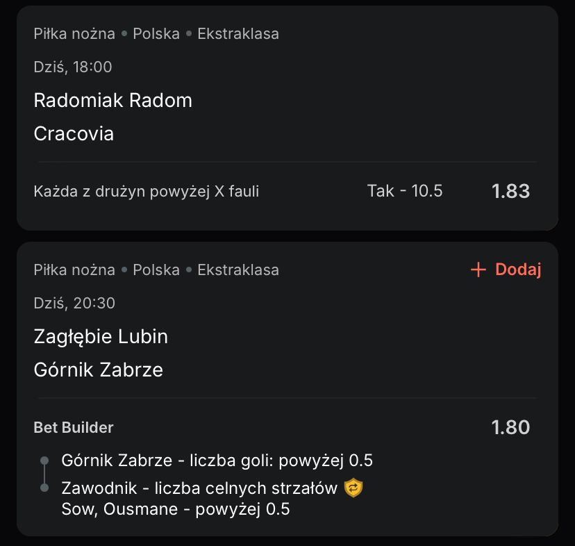 Piątkowa oferta niczym nie różni się od tych z poprzednich tygodni – meczów niewiele, wybór mniejszy, dlatego nie czarujemy i idziemy w polskie granie. Dziś w Ekstraklasie mecze w Radomiu i Lubinie, na które mamy pewien pomył w postaci Bet Buildera oraz zakładu na faule. Co wymyśliła nasza redakcja? Za moment poznasz nasze propozycje na piątek.