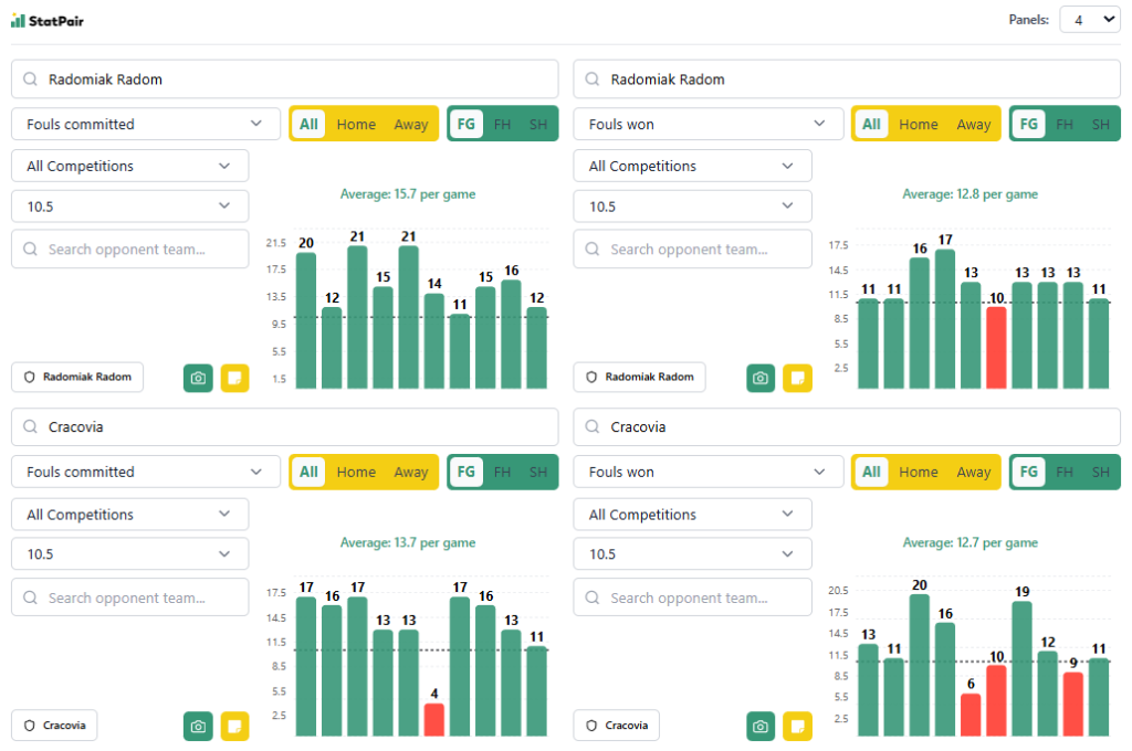 Podejdźmy do tego statystycznie i zerknijmy po prostu w historię fauli. Radomiak linię 10,5 pokrywał w 13 z 14 meczów tego sezonu, nie zrobił tego jedynie na inaugurację z Pogonią, więc jego seria wynosi aż 13 spotkań. Z faulami rywali jest podobnie – nie zrobiła tego tylko Pogoń oraz Motor Lublin, zatem mamy 12 na 14 przypadków na plusie. W przypadku Cracovii jest tak samo dobrze. „Pasy” faulowały min. 11 razy w 13 z 14 spotkań, w tym w każdym ze starć rozgrywanych poza Krakowem, natomiast ich rywale linii nie pokryli w tym czasie 4 razy. Jak na polskie podwórko 11 przewinień to niezbyt wygórowana liczba (taką średnią/mecz ma 15 z 18 zespołów), dlatego wierzymy w powodzenie.
