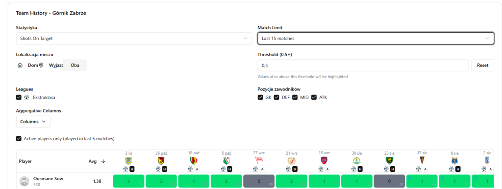 Co do celnego strzału: Ousmane Sow to chyba największa gwiazda Górnika, a także absolutna topka Ekstraklasy. Skrzydłowy z Senegalu gra bardzo, ale to bardzo efektownie, a przy tym i efektywnie, bo ma na koncie już 7 goli. Jak na razie rozegrał on 12 meczów i aż 10 z nich kończył z celnym strzałem, a w dwóch poprzednich kolejkach notował 2 i 3 celne próby.