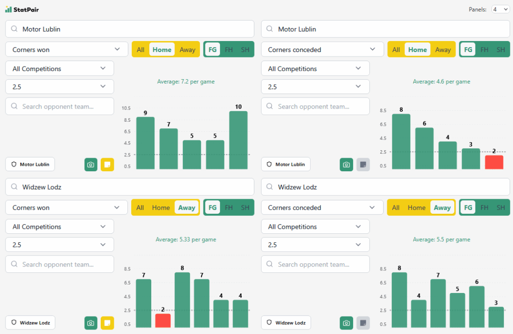 Co do rogów, w przypadku Motoru klasyk. Oni nie tylko pokrywają linię 2,5 – oni przez cały trwający sezon ani razu nie zeszli poniżej 5! Rywale też nie mają problemów z nabijaniem ich, bo sztuka ta nie udała się tylko GKS-owi Katowice w ostatniej kolejce (grał w 10 przez pół meczu). Widzew sam też nie ma problemów z pokrywaniem tej linii, zwłaszcza na wyjazdach, gdzie robił kolejno 7, 2, 7, 8, 4 i 4 kornery. Jak robią to jego rywale? Tylko dwóm się nie udało, a z Widzewem na swoim terenie mieli oni jednak zawsze 100% skuteczności.