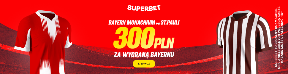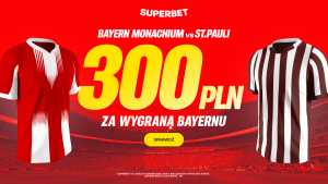 W ten weekend nowi gracze mają kilka okazji na odebranie dodatkowego bonusu, a najlepszą wydaje się być 300 złotych za zwycięstwo Bayernu Monachium z St. Pauli mającym serię 8 porażek z rzędu. Wystarczy dokonać pełnej rejestracji z kodem PEWNIACZKI, wpłacić pierwszy depozyt na min. 50 złotych i za 2 złote zagrać singla na taki właśnie typ.