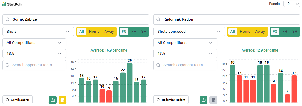 Tak jak napisaliśmy wyżej – podobnie jak tydzień temu gramy strzały Górnika. Radomiak pod wodzą Goncalo Feio spisuje się nieźle (choć z Lechem przegrał wyraźnie) i to chyba wpłynęło na kursy i linie w statystycznych zakładach, co traktujemy jako okazję i zachętę. Uważamy, że zabrzanie są w stanie oddać w Radomiu minimum 14 strzałów, co podpowiadają nam liczby z poprzednich meczów.