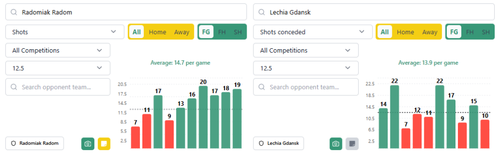 A co z liczbami? Radomiak tutaj wygląda bardzo dobrze, bo w trakcie sezonu wypracował średnią blisko 15 uderzeń/mecz, a linię 12,5 pokrywał w 9 z 13 spotkań. Ostatni raz poniżej kończyli dość dawno, bo 29 sierpnia w Katowicach, a później zanotowali serię 13, 16, 20, 17, 18 i 19 strzałów, zatem pod tym kątem prezentują się wzorowo. Lechia u siebie dopuszcza do zdecydowanie mniejszej liczby strzałów niż na wyjazdach, ale nakręcony przez Feio Radomiak może tutaj pokryć linię mimo tego faktu.