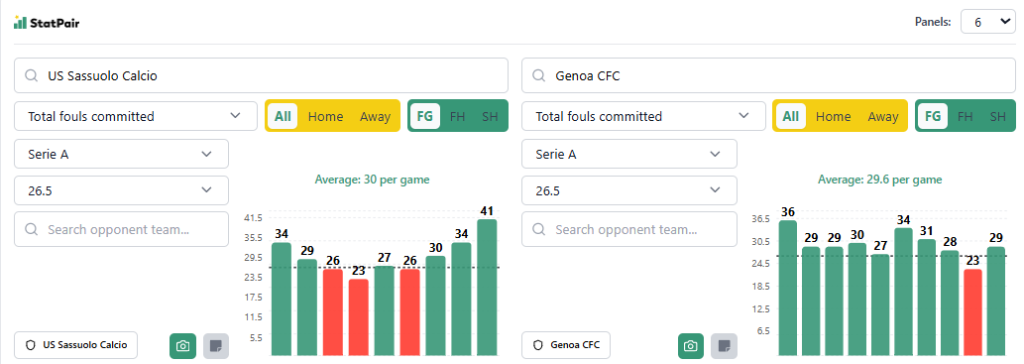 Co mamy na myśli? To, że są to dwie ekipy sporo faulujące i generujące sporo fauli przeciwników. Sassuolo w 7 z 9 meczów było faulowane minimum 14 razy, a samo tyle przewinień zaliczało 6-krotnie. W przypadku Genoi wygląda to bardzo podobnie – 14 fauli w 8 z 9 kolejek oraz 100% meczów z min. 12 przewinieniami rywali. Łącznie linia 26,5 była pokrywana w 6 z 9 meczów Sassuolo, a Genoa poniżej zeszła zaledwie raz. Skoro te kluby grają w ten sposób to wielką niespodzianką będzie, jeśli tutaj skończy się mała liczbą przewinień.