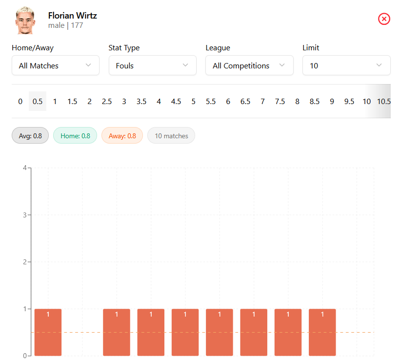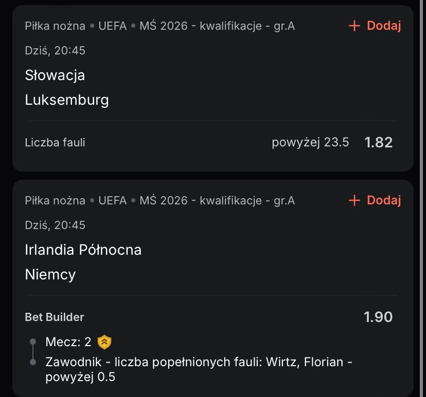 Podbijamy to faulem Floriana Wirtza, który powinien zagrać dziś w podstawie. Jest to ważny mecz z uwagi na stratę punktów na początku, także Niemcy chyba sprawy nie pokpią. Sam Wirtz ma trudny początek w Liverpoolu i nie zapisuje się w protokołach meczowych, choć faule zalicza regularnie. W Premier League 4/7 meczów kończył z przewinieniem, w Lidze Mistrzów 2/2, w kadrze eliminacjach 3/3, a ostatnich 10 meczów to 80% pokrycia takiego zakładu.
