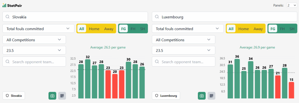 Słowacja to reprezentacja, która fauluje dużo (w trakcie tych eliminacji kolejno 12, 14, 12), a sama jest koszona jeszcze częściej (17, 14, 14), podobnie było zresztą w Lidze Narodów. Luksemburg też kosi regularnie, i sam regularnie zaczyna od 14, choć jego koszą różnie. Ostatniego meczu z Niemcami nie uwzględniamy w analizach, bo tam było szybkie wykluczenie jednego z zawodników i czerwona kartka już w 20 spotkania. Pierwszy mecz tych reprezentacji to aż 28 fauli i niewiele wskazuje na to, żeby akurat dziś było inaczej.