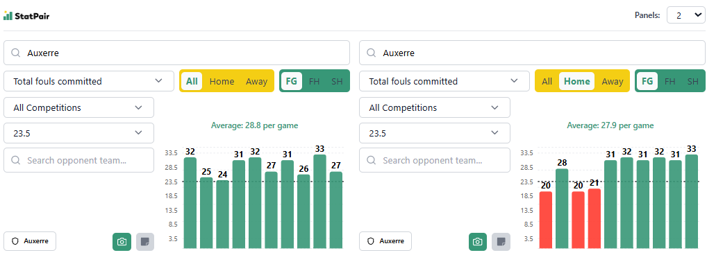 Co mamy na myśli? Dokładnie to, że Auxerre w bieżącym sezonie wraz ze swoimi rywalami pokrywało linie 23,5 w 100% spotkań. Gospodarze sami faulują sporo, więc oni do tej puli przeważnie dorzucają więcej – średnia 14 fauli/mecz, w 7 spotkaniach wypełniona połowa linii. Najciekawiej (na nasze szczęście) jest w meczach, które rozgrywają u siebie – tutaj mieliśmy kolejno 32, 31, 32, 31 i 33 faule! W skrócie: liczby, których nie powstydziłyby się najostrzej grające ekipy w Serie A. W przypadku Marsylii wygląda to różnie, choć też biedy nie ma – over pokryty był na czysto w 4/10 ostatnich spotkań, trzy razy kończyło się na styku z liczbą 23. Faworyt sam też fauluje sporo (7/10 ostatnich meczów z min. 14 przewinieniami) i choć w drugą stronę nie generuje tego sporo to jednak trafia na w miarę ostrego przeciwnika.