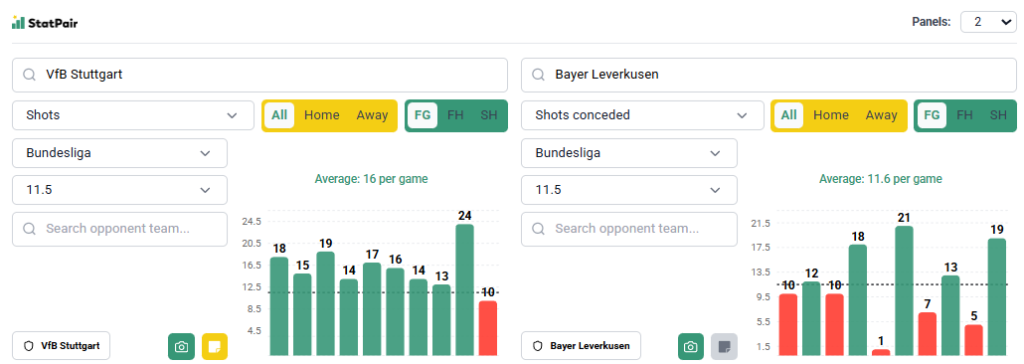 Zaznaczamy: Bayer u siebie nie dopuszcza do dużej liczby strzałów, a w Bundeslidze wymagany wynik osiągnęły tylko drużyny Eintrachtu i Borussii M’Gladbach. Nie oznacza to jednak, że nie da rady, bo generalnie linię pokrywały zespoły słabsze, a we wszystkich rozgrywkach robiło to 7 z 10 przeciwników. Tutaj należy skupić się głównie na Stuttgarcie, który strzela bardzo dużo i regularnie dowozi takie wyniki. 10 ostatnich meczów to 8 overów, w lidze na wyjeździe tylko jeden wynik poniżej (7 pozostałych to min. 14), w całym sezonie Bundesligi średnia 15,5/mecz, generalnie maszynka do nabijania uderzeń. Uważamy, że goście powalczą i nie wystraszą się Bayeru, zatem taka linia jest jak najbardziej do pokrycia.