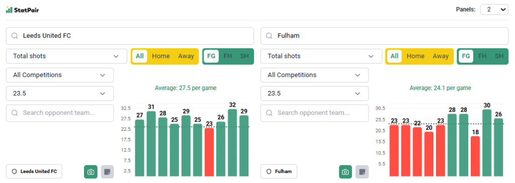 Leeds na swoim terenie oddaje naprawdę dużo strzałów, więc możliwe, że to właśnie „Pawie” pokryją większość naszego zapotrzebowania. Fulham generalnie też nie może narzekać na liczby, bo ich średnia strzałów na mecz wynosi równe 12, a ich przeciwnik pozwala też na całkiem sporo. Goście w kwestii overów meczowych prezentują się różnie, choć ostatnie tygodnie były świetne. 5 poprzednich spotkań to 28, 28, 18, 30 i 26 strzałów, wcześniej mieliśmy aż trzy spotkania na styku (23). Jeszcze lepiej wygląda to w przypadku Leeds, które linię 23,5 pokrywało w 9 z 10 poprzednich meczów Premier League (większość przypadków z dużym zapasem), a u siebie robiło to w 8 z 10 spotkań (ostatnio 28, 31, 28, 29 i 26). Jedni i drudzy są w bardzo dobrej formie, więc spodziewamy się walki o pełną pulę z obu stron – tutaj możemy mieć naprawdę sporo sytuacji podbramkowych.