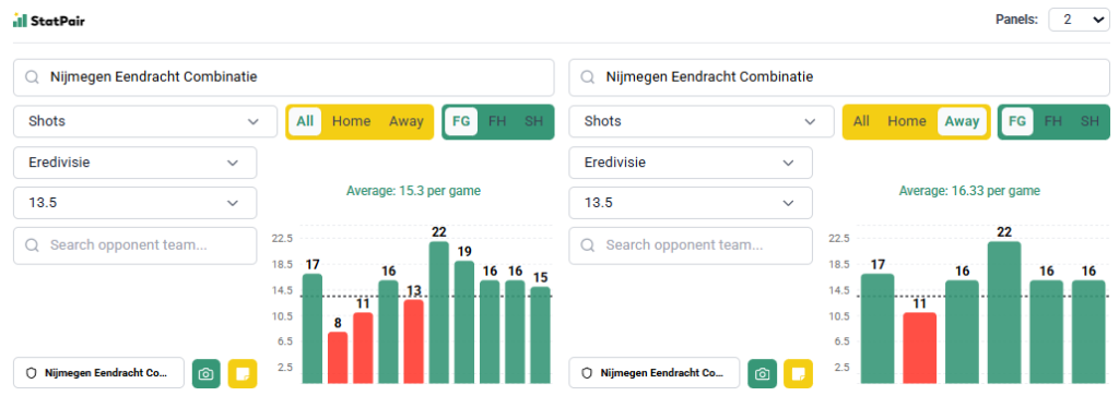Czy coś może zastanawiać? Na pewno fakt, że ostatnio (poza meczem z Groningen – 16) gospodarze nie dawali sobie wbić tylu strzałów. Kilku mocnych i często uderzających rywali kończyło takie mecze z underem, ale wcześniej zdarzały się też solidne wyniki, jak choćby pierwszy mecz bezpośredni i aż 18 prób NEC, 20 po stronie Feyenoordu czy 25 w wykonaniu AZ Alkmaar. Głównie liczymy tu na gości, podobnie jak niedawno na Groningen, które startowało z podobnej pozycji. Nijmegen pokrywało linię w 5 kolejnych meczach ligowych (m.in. z Ajaxem i Feyenoordem), a do tego na wyjazdach spisuje się bez zarzutu. 9 meczów w roli gościa to tylko 2 undery, a poprzednich 5 spotkań to 11, 16, 22, 16 i 16 uderzeń.