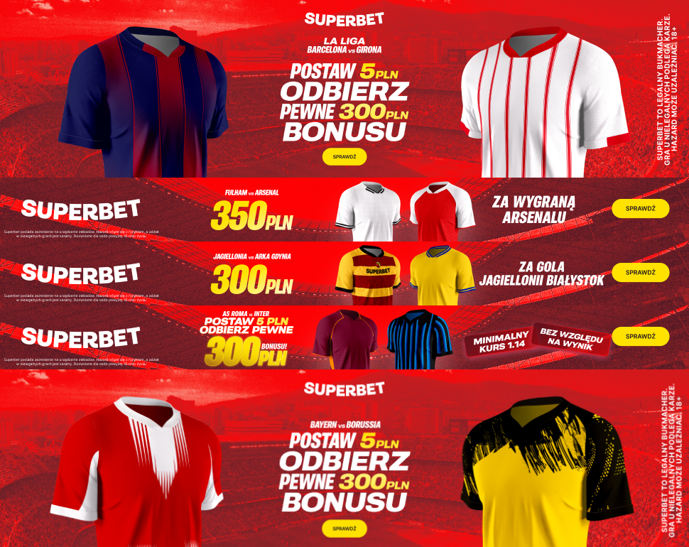 Weekend to liczne promocje, w czym kolejny raz bryluje bukmacher Superbet. Na graczy, którzy dokonają pełnej rejestracji z kodem PEWNIACZKI czekają aż cztery opcje na zagarnięcie dodatkowych środków bonusowych na grę: