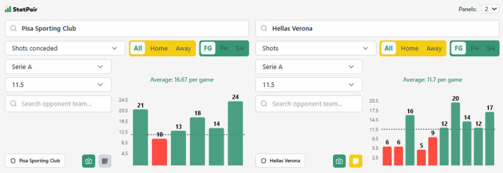 Jeżeli śledzicie nasze social media to wiecie, że opublikowaliśmy ciekawa nitkę ze statystykami. Jedną z ciekawostek była liczba strzałów oddawanych przez Veronę – do tej pory zespół kojarzony głównie z chorą liczbą fauli. W ten weekend będzie miała ona doskonałą okazję, aby jeszcze wyśrubować i tak całkiem wysoką średnią, bo zmierzy się z Pisą i liczymy, że odda 12 strzałów lub więcej.