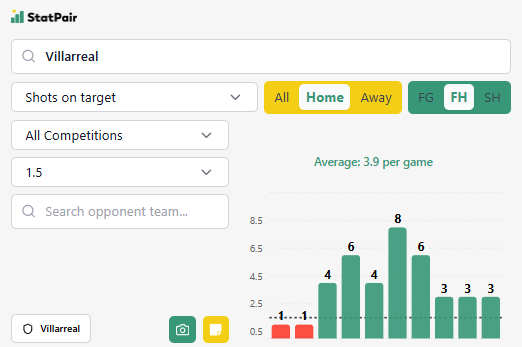 - Nasz typ: +1,5 celnych strzałów Villarrealu w 1. połowie
