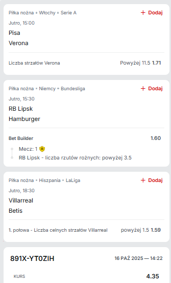 14 – tyle wynosi średnia strzałów Verony na mecz w tym sezonie Serie A. Nie jest to jakaś kosmiczna liczba, ale patrząc na jej siłę trzeba dać temu wyraz uznania. Głównym motorem napędowym jest tu Gift Orban, który sam dorzuca średnio 5 uderzeń, co jest wynikiem na miarę Mbappe czy Yamala. Jak na razie goście tej potyczki linii 11,5 nie przekroczyli tylko w pierwszej kolejce z Udinese (9) – później robili to w każdym kolejnym meczu notując kolejno 12, 20, 14, 12 i 17 uderzeń. Pułap osiągali nie tylko z Cremonese czy Sassuolo, ale też z Lazio, Romą i Juventusem, zatem mogą zrobić to również teraz.