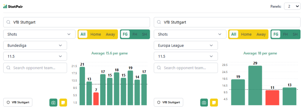 Linia 11,5 nie wygląda na zbyt wymagającą, jeśli weźmiemy pod uwagę fakt, że Stuttgart to trzeci najczęściej strzelający zespół ligi po Bayernie i Lipsku. Średnia 15,6 uderzeń/mecz wygląda świetnie i choć rywal nie należy do łatwych to jednak jest to do zrobienia. Goście sezon zaczęli od 14 strzałów z Bayernem w Superpucharze, a potem w spotkaniach ligowych tylko raz nie zdołali pokryć linii – było to w starciu z Freiburgiem. Tak samo dobrze było w DFB Pokal (15, 17), Liga Europy również wstydu nie przyniosła (19, 29, 11, 13) – tutaj mamy prawdziwą powtarzalność. Tylko dwa spotkania poniżej zakładanego poziomu? Bierzemy!