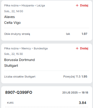 W niemieckiej Bundeslidze to najciekawsze spotkanie tego weekendu. Legalni bukmacherzy faworyta widzą w BVB, jednak Stuttgart raczej się nie położy i w Dortmundzie powinien powalczyć pokazując ofensywną piłkę. Patrząc na kurs oraz statystyki gości zakład na min. 12 strzałów w ich wykonaniu wygląda bardzo atrakcyjnie.
