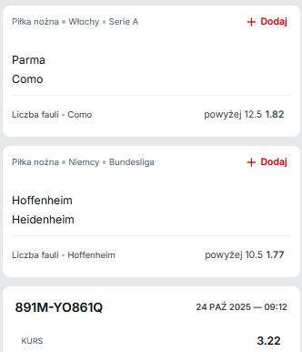 Od początku sezonu, po zmianie trenera, Hoffenheim popełnia dużo fauli, co trafiliśmy ostatnio po bardzo przyjemnym kursie. Tym razem linia jest jeszcze niższa, dlatego długo nie trzeba było tego analizować – zakład na +10,5 przewinień gospodarzy wygląda bardzo interesująco. Tutaj podobnie jak w przypadku Como – nawet, jeśli z biegiem czasu podskoczy do góry o szczebelek, wciąż jest to do gry.
