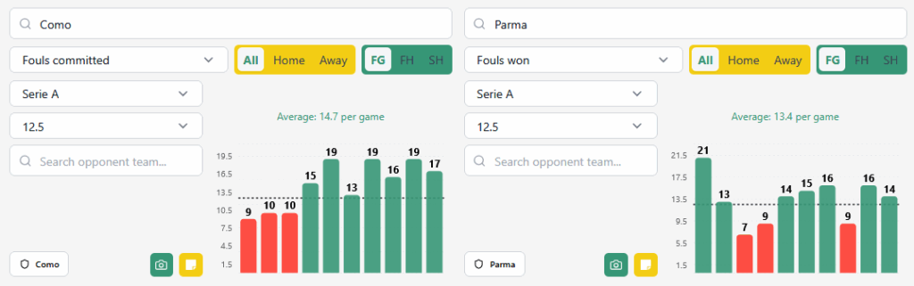 100% – oto skuteczność Como pod kątem fauli i wybranego przez nas zakładu. Pokrycie linii 12,5 w każdym meczu tego sezonu to doskonała wiadomość, bo nie jest ona postawiona przesadnie wysoko jak na włoską Serie A. Ile konkretnie przewinień popełniało Como? 15, 19, 13, 19, 16, 19 i 17, zatem liczby naprawdę rzucające się w oczy.