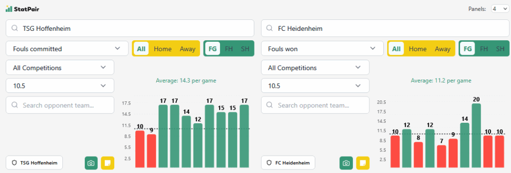 Tydzień temu pisaliśmy dokładnie to samo i… wygraliśmy fajnego dubla z faulami. Hoffenheim zmagania zaczęło od 17 przewinień w pucharze z Hansą Rostock, a w lidze się nie zatrzymało notując kolejno 17, 14, 12, 17, 15, 15 oraz 17 fauli. Te liczby są naprawdę mocne i pytanie brzmi: kiedy się to zatrzyma? Mamy nadzieję, że nie teraz, chociaż nam 15 czy 17 nie potrzeba – linia 10,5 jest postawiona dość asekuracyjnie. Heidenheim jest faulowane różnie: 3 razy over, 2 razy równe 10, 2 razy wyraźny under. Jak widać, jest to całkiem podobny przypadek do St. Pauli, które wygenerowało w niedzielę aż 17 przewinień Hoffenheim.