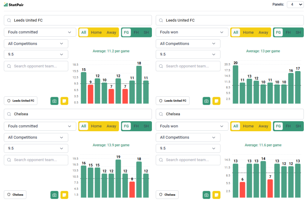 Czy Leeds fauluje dużo? Niekoniecznie, choć w 9 z 13 spotkań ligowych tego sezonu pokrywało linię 9,5. Umówmy się, nie jest to jakiś pułap z kosmosu, a kiedy beniaminek gra z drużyną z czołówki to można założyć, że lekko podostrzy. Co dla nas ważne: poza inauguracją z Evertonem gospodarze faulowali 10 razy lub więcej w 5 kolejnych meczach domowych. Dobrze wyglądają też liczby ich rywali, którzy spełniali nasz warunek w 10 meczach z rzędu, a Manchester City w weekend zrobił to aż 17 razy. O faulach Chelsea pisaliśmy przy okazji niedzielnego meczu z Arsenalem. Linia 9,5 zaliczona w 9 z 10 ostatnich spotkań, a rywale robili to jeszcze lepiej – aż 9 z nich popełniało 12 przewinień lub więcej. Składając to do kupy mamy podejrzenie, że w tym meczu też może być ostro.