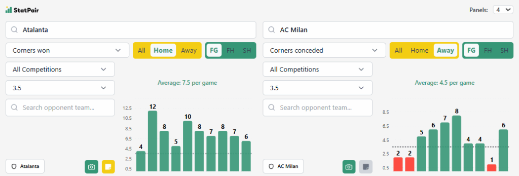 Co do rogów: Atalanta ostatnio nabija ich sporo. 6 poprzednich meczów to minimum 5, a ostatnia kolejka z Cremonese to aż 10. Najlepiej wygląda to w meczach u siebie, bo na stadionie w Bergamo mamy serię aż 10 spotkań z pokrytą linią 4,5, przy czym tylko raz były to równe 4 rogi. Jeśli chodzi o Milan to on w roli gościa przed kornerami broni się kiepsko – na ostatnich 8 wyjazdów tylko raz rywale nie pokryli zakładanej przez nas linii. W minionym sezonie Atalanta z Milanem u siebie zrobiła 7 rogów, na wyjeździe 5 i liczymy, że teraz nie zaprezentuje się podobnie.