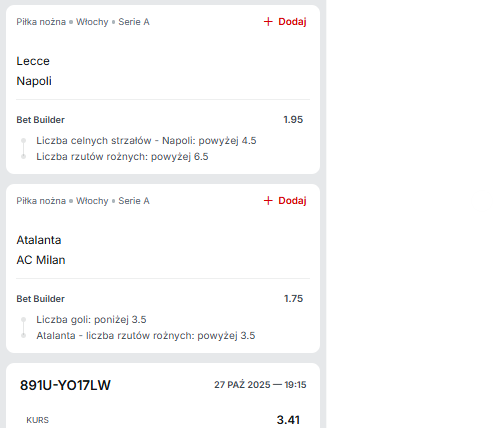 Lecce – Napoli i Atalanta – Inter: oto wtorkowe mecze najbliższej kolejki włoskiej Serie A. Wyboru dużego nie ma, a skoro nie chcemy ruszać pucharów to gramy na kuponie właśnie te spotkania. Statystycznie każda ze składowych broni się bardzo dobrze, chociaż wiadomo jak to bywa z liczbami. Czasami ktoś nabija rogi czy strzały seriami, a danego dnia wynik determinuje zupełnie inny przebieg wydarzeń.