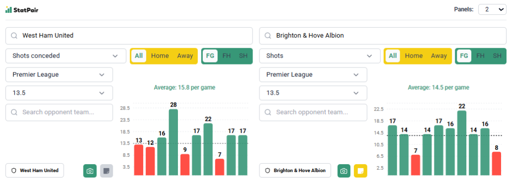 W tym sezonie łączna średnia gości nie powala, bo nieco przekracza 13 strzałów/mecz. To siódmy wynik w lidze, natomiast zerknijmy na poszczególne spotkania. Tutaj ostatnie tygodnie prezentują się wręcz wyśmienicie, bo Brighton na 10 kolejek tylko dwukrotnie nie potrafił pokryć linii 13,5 (z Crystal Palace i Arsenalem). Co ciekawe, nie tak dawno (7 grudnia) oddał aż 22 strzały w domowym meczu z… West Hamem, zatem z tym przeciwnikiem już sobie świetnie poradził. Patrząc na same wyjazdy nie ma biedy, bo 4 z 6 spotkań to zielony kolor. West Ham w grudniu rozegrał 5 meczów i… radził sobie kiepsko – 17, 22, 7, 17 i 17 strzałów rywali dają nadzieję na wygraną.